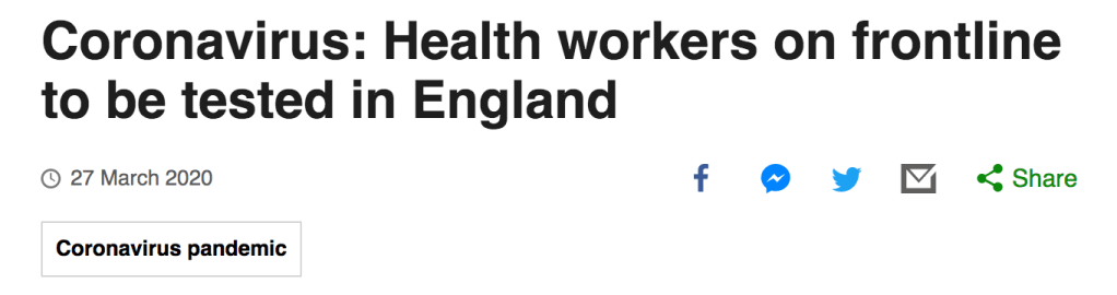 In Italy 20% of healthcare workers have been infected with COVID-19. (2) Only in the past several days has the UK government announced that it will begin testing healthcare workers for COVID-19. The lack of testing for staff has been described as “illogical” by the head of the British Medical Association. (3) Previously staff had been instructed to self-isolate only if they developed symptoms of COVID-19 or if someone that they lived with developed symptoms of fever, persistent cough or shortness of breath. However no formal testing has been undertaken to provide clarity for staff on whether or not they have indeed been infected with the coronavirus. This has produced unnecessary anxiety for staff regarding whether they themselves, or their families, were are risk from the infection. This also kept perfectly healthy healthcare workers away from the frontlines, where they have been needed, due to a family member or flatmate being unwell.