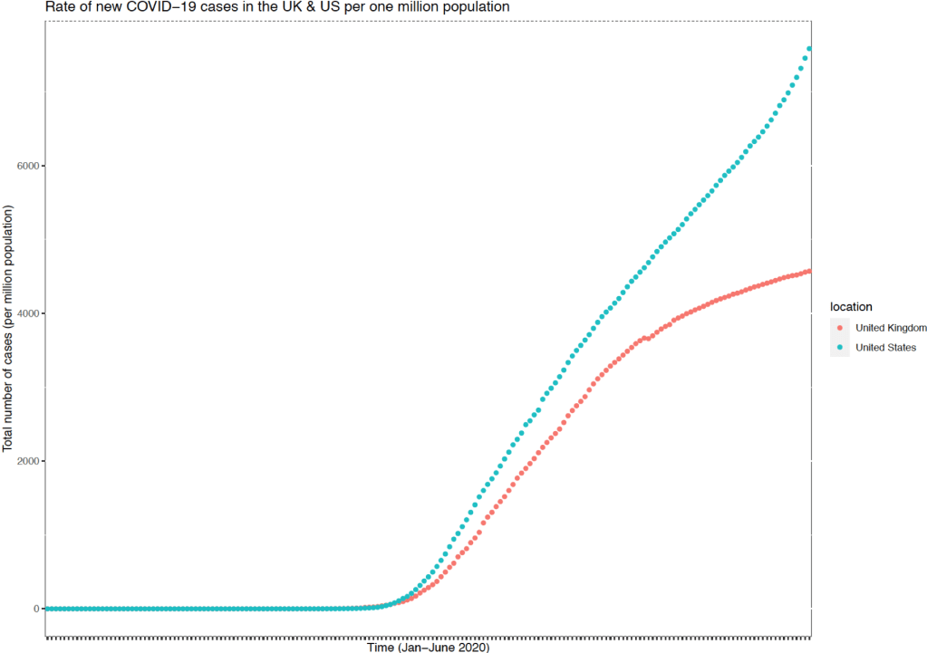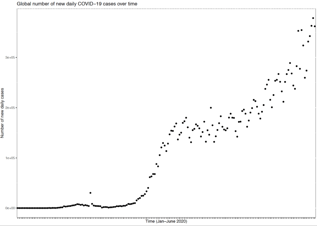 Recently I have been coding much more thanks to my ongoing research. As such, I have been working extensively with data and R, an open-source programming language used for statistical analysis of big data and even machine learning. I first began working with big data sets and R about three years ago when I went to work at the WHO. On my first day I was given a ‘big data set’ containing 350,000 individual cases of data with about 300 variables collected on each case. That’s 105 million individual ‘objects’, or pieces of information, to deal with. Naturally, I tried to open this in Excel… That didn’t go particularly well as my computer attempted to load the data for about 20 minutes and then crashed. R was built for this very issue; it was built to manipulate huge spreadsheets of information and quickly and powerfully apply functions to the data. Over the past three years, I have consistently built on my skills with R and statistics, even dipping my toes into machine learning and computer vision. Yesterday, I had a thought—I downloaded a dataset on COVID-19 and gave myself an hour to draw out some interesting patterns. So here is the result of this challenge!