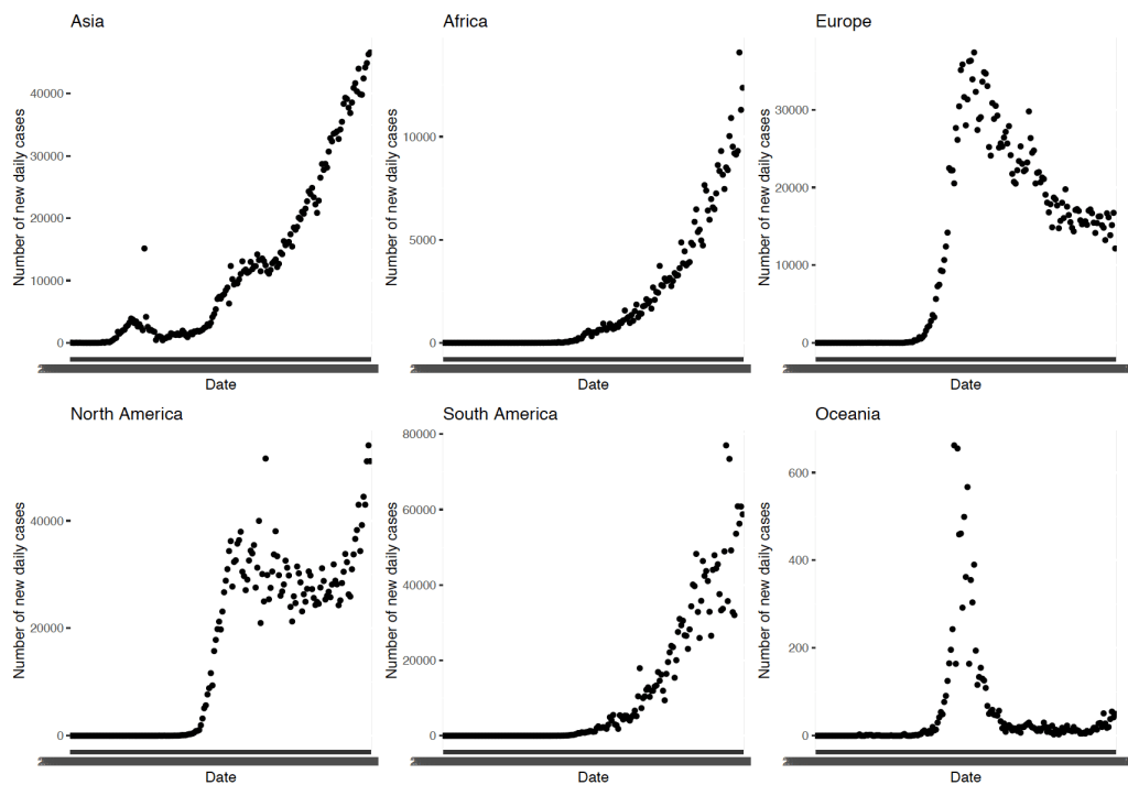 There are some (tentative) success stories, though. Europe was hit early and hard by COVID-19 cases, with surges seen early into the pandemic in Italy and Spain. Much of western Europe has subsequently been affected by huge numbers of COVID-19 cases as can be seen by the swathes of red in Figure 4. The number of new daily cases is now falling in Europe (Figure 3), which is cause for some relief. However it must be remembered that, as shown in Figure 3, there are over 10000 new cases each day in Europe alone, so we are still some way off from full virus suppression. Oceania seems to have done remarkably well as a region due to early and aggressive measure of lockdown and containment. This has been pivotal in reducing the spread of the virus and in stopping the exponential growth in COVID-19 cases seen in other regions.